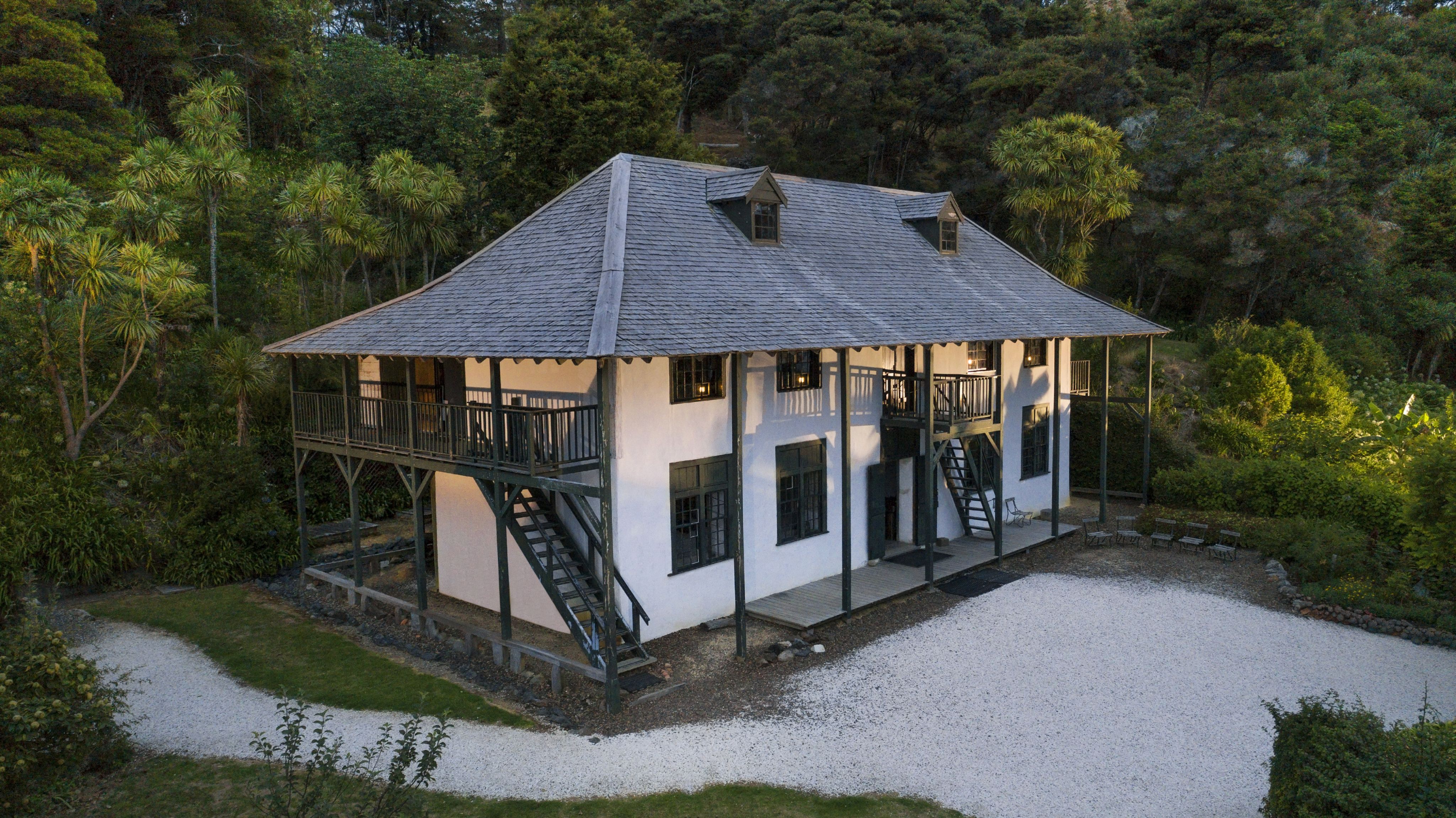 Architectural Significance and Gothic Revival Style Built in 1877, Ruatuna was constructed from kauri timber in a style that blends early colonial architecture with Gothic Revival elements, showcasing the aspirations and aesthetic preferences of the Coates family. The house’s interior includes a Gothic-inspired design with exposed timber framing and rooms open to the roof with the pegged timber frame of the house fully visible. with the pegged timber frame of the house fully visible
