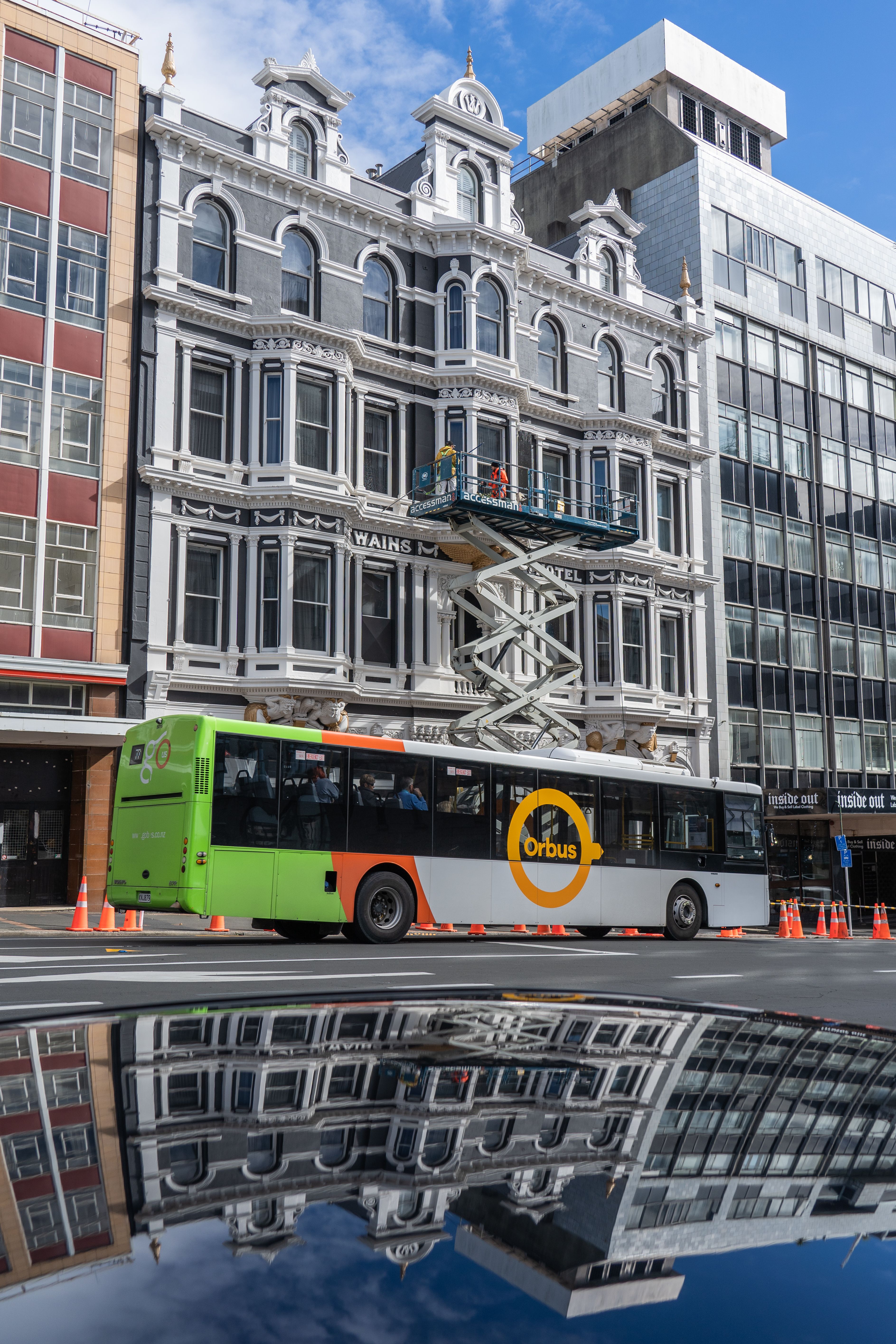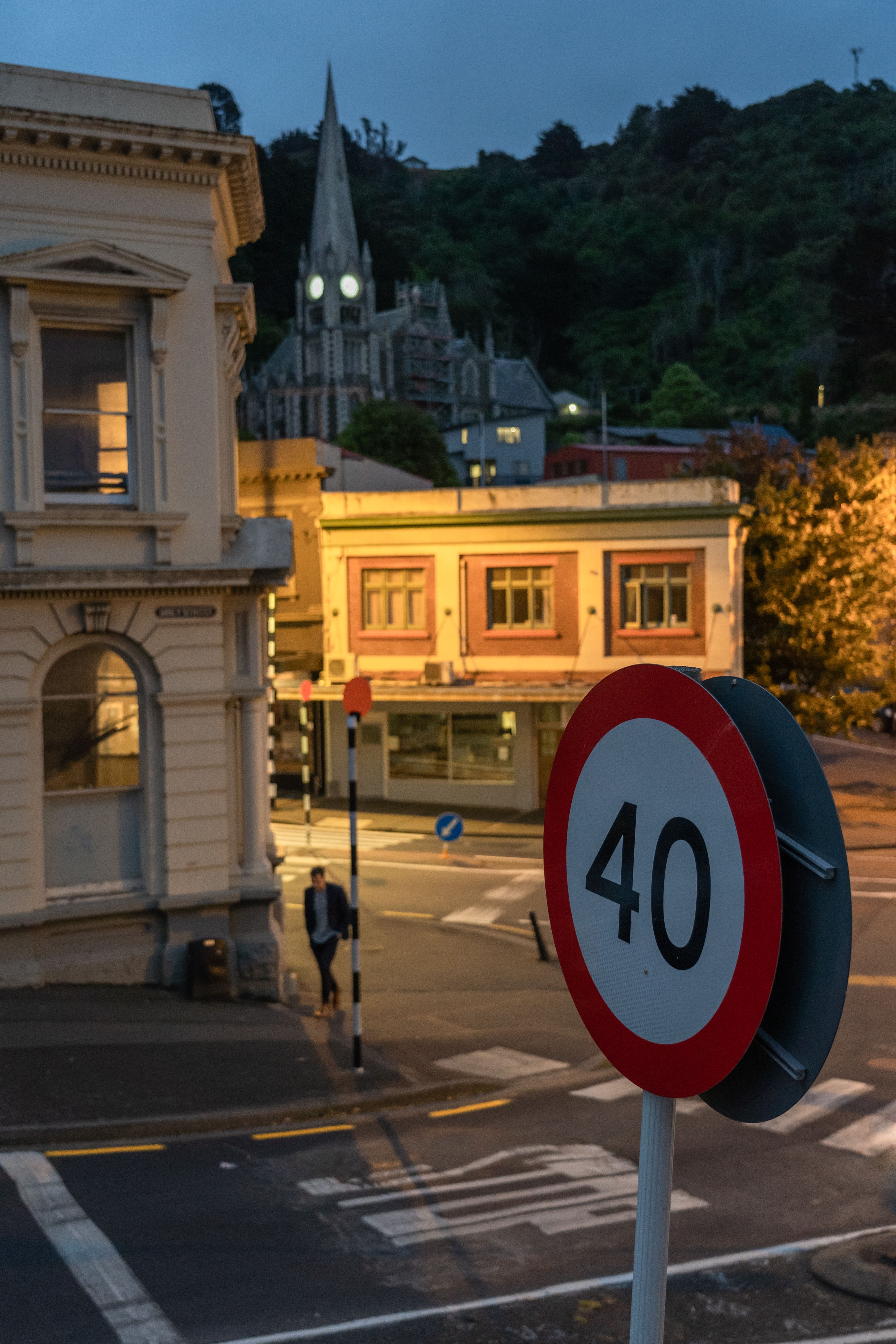 “I could tell you a story about these buildings... I could tell you about how the Dunedin City Council would like the historic facades to be retained. Or about how the owners/developers have let them fall into ruins... But instead, I was attracted, on that grey day, by the vibrant colours of the orange plastic safety fencing and the graffiti on the rotting walls behind.”